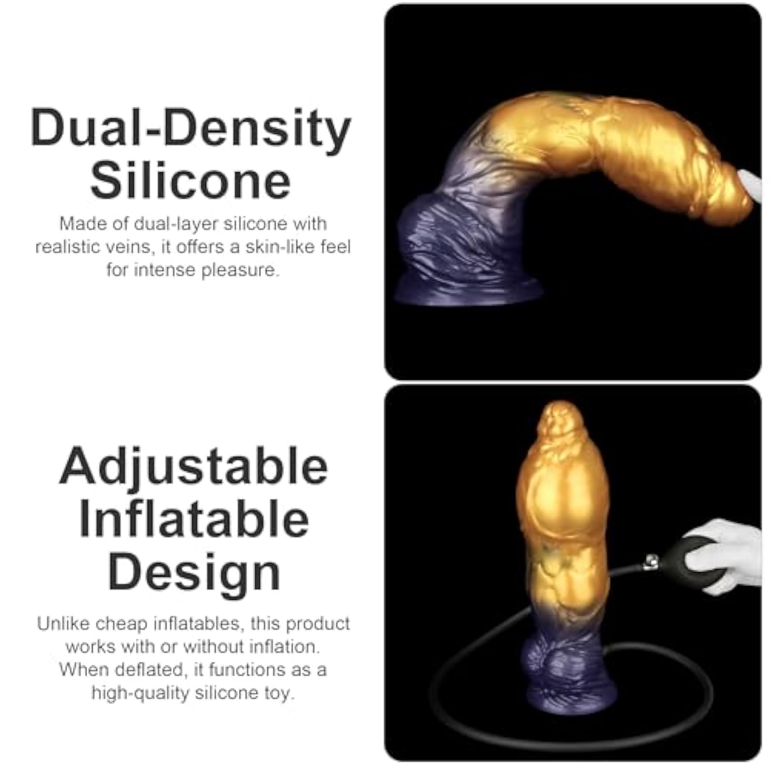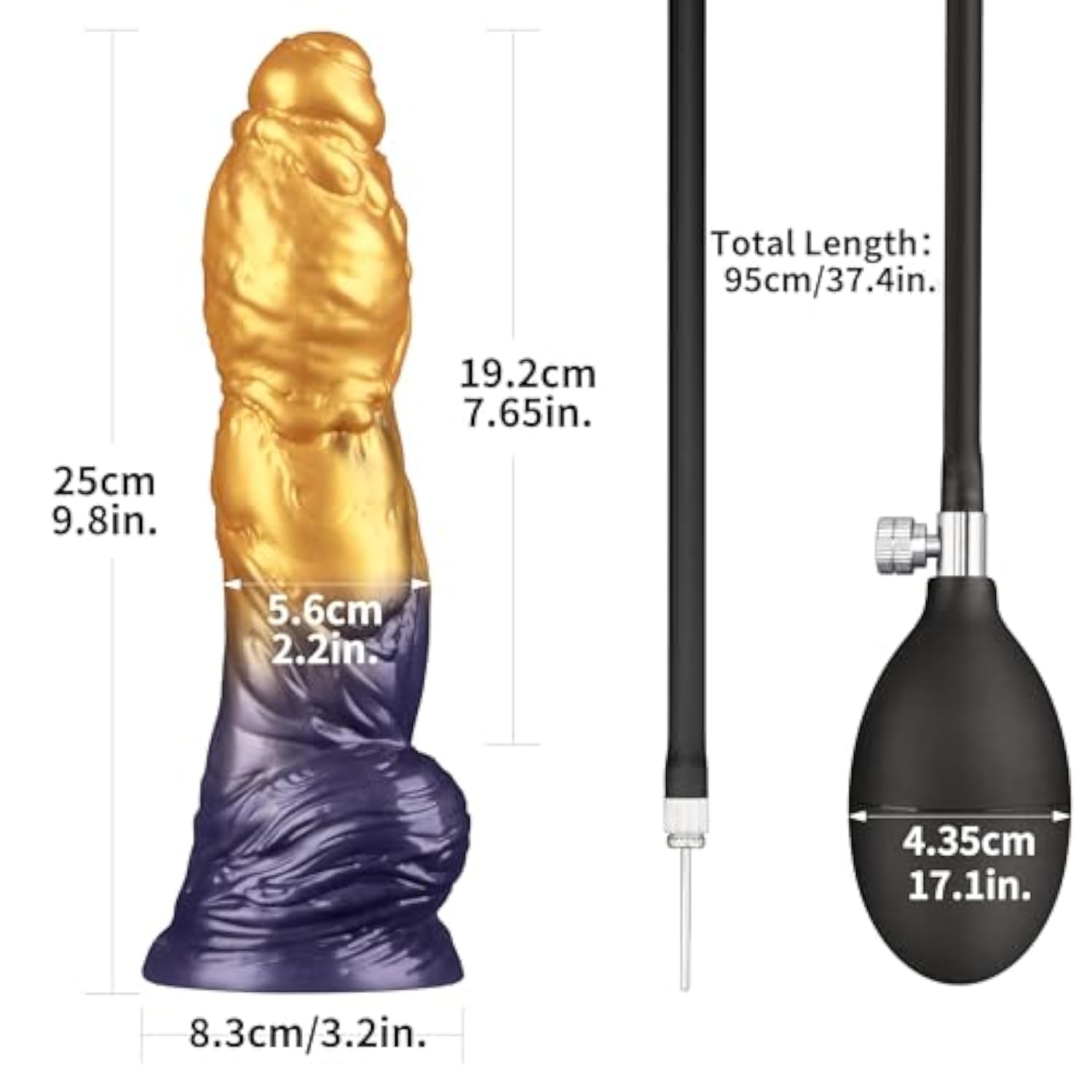 | Dual-Density Platinum Silicone With Inflation Control?Crafted From Ultra-Soft Dual-Layer Platinum Silicone With A Firm Inner Core, This Dildo Mimics A Lifelike Feel While Allowing You To Inflate For A Custom-Fit Experience. | | One Toy For All Sizes?No Need To Own Different Sizes. This Inflatable Dildo Adapts To Your Preferred Level Of Fullness, Whether Vaginally Or Anally. | | Removable Bulb For Seamless Movement?Inflate To Your Desired Size, Then Detach The Bulb For Full Freedom Of Movement—Perfect For More Immersive Solo Or Partner Play. | | Powerful Suction Cup Harness Compatible?Stick It To Any Smooth Surface For Hands-Free Fun Or Secure It In A Harness For Adventurous Fantasy Play. | | Ideal Size: Total Length 10”, Insertable Length: 9.25” , Circumference: 6.7”, Inchessuction Base Diameter: 3.27”. Max Length:12.9” Insertable Length:12.5”, Circumference:14.9”. Warning: Do Not Exceed 50 Pumps To Prevent Over-Inflation | |