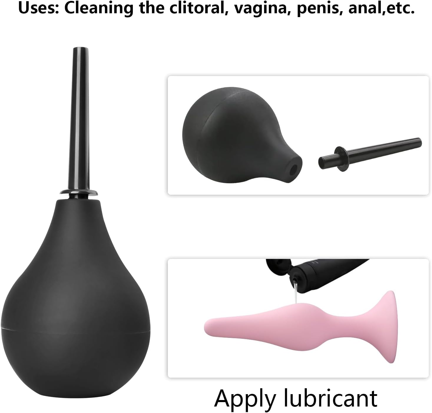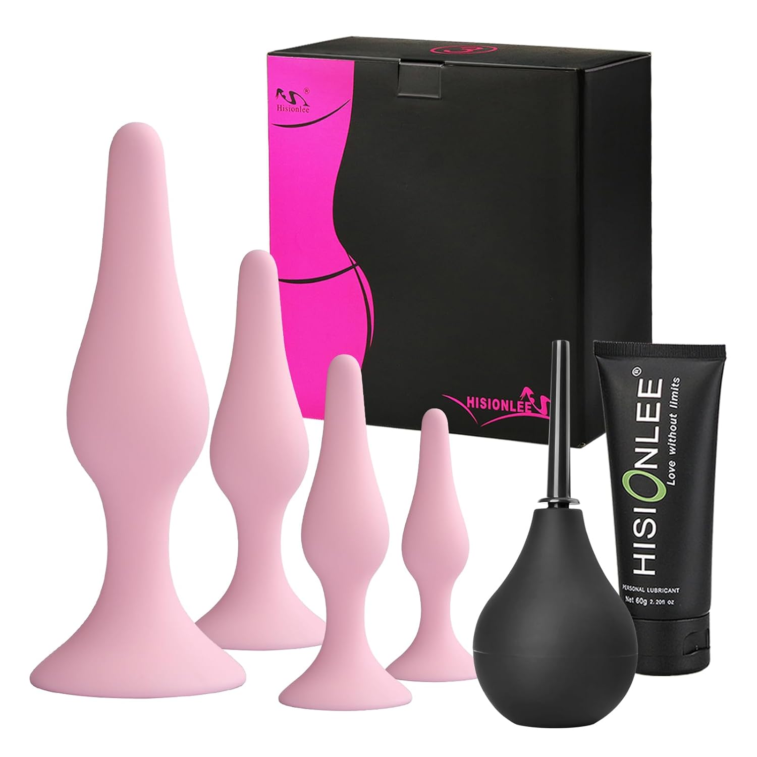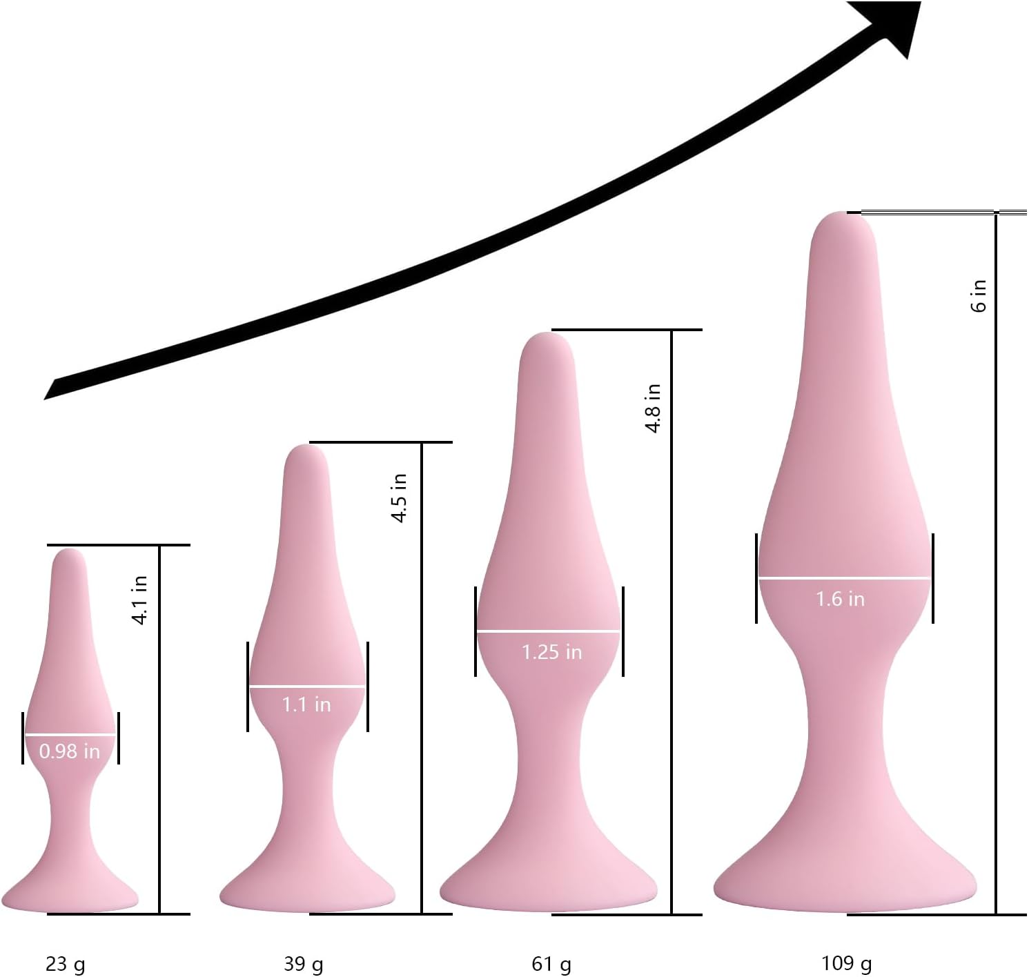 ? 4 Sex Toys Size – Small butt plug 4 x 1 inch, Medium anal plug 4.5 x 1.12 inch,Large sex toy 4.8 x 1.25inch, X-Large adlut toy 6 x 1.5inch; Package includes 4pcs anal plugs, Enema black 89ml and Lubricant 45g,Enema is used to treat certain types of infections; Lubricants can relax and relieve pain.