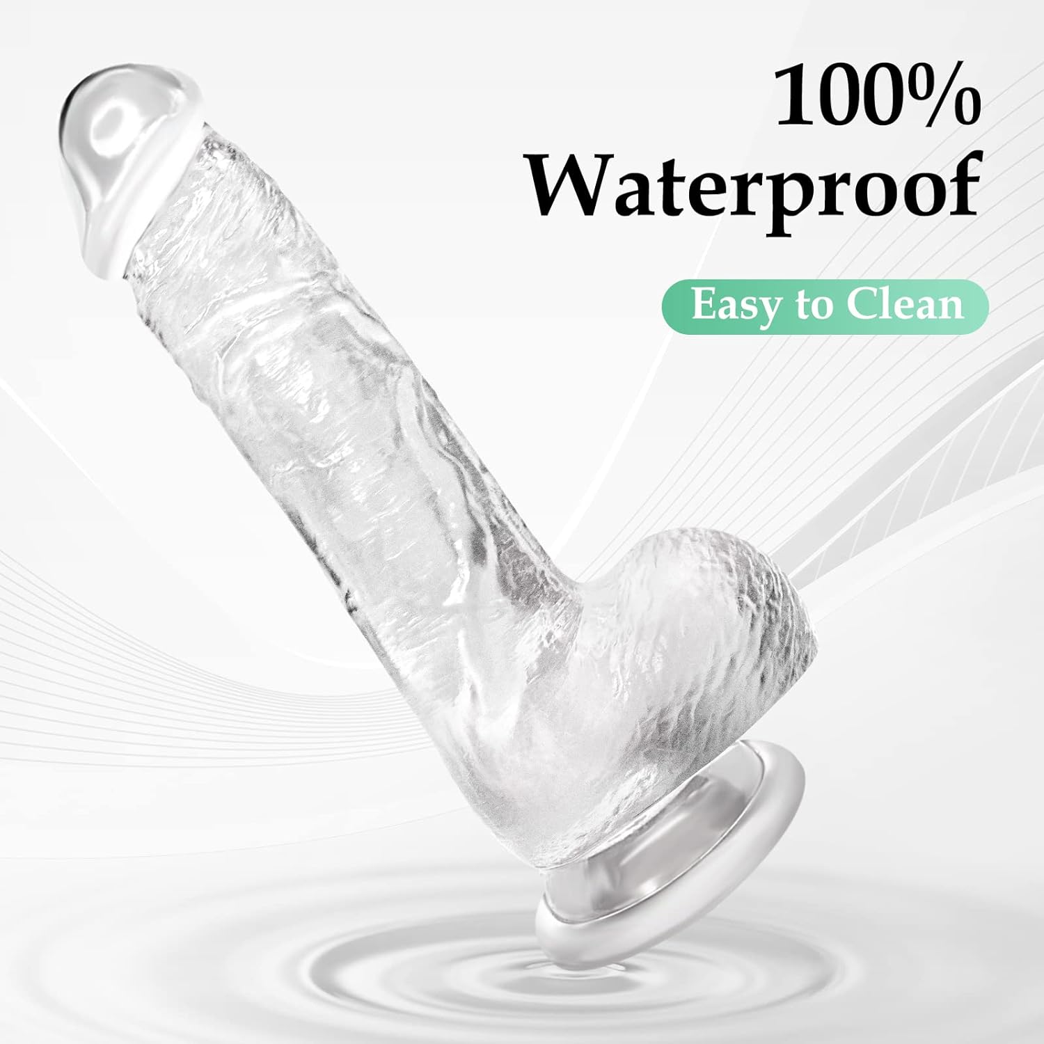 Waterproof Easy to Clean: This Realistic clear dildo is Daily waterproof, can be fully sinked in Water(Bathtub), very suitable for hot and steamy shower sex! This non-vibrating dildo with balls can stick to your shower door or tub wall, abd can be cleaned directly with water-tap.