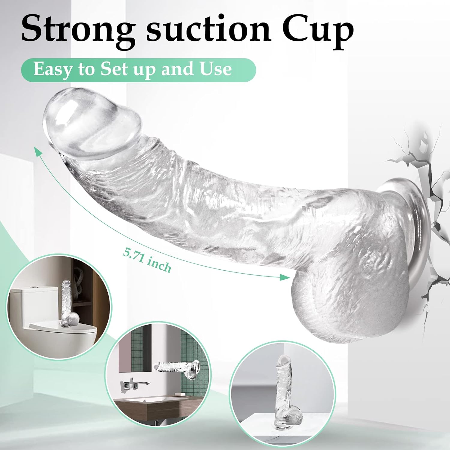 Realistic Lifelike Dildo with Veins design and Proper scale : The clear dildo has smooth and soft skin, made of human safe material, flexible shaft with lifelike penis Veins design. The SIZE and SHAPE of Clans and balls are both elaborately picked and made. Aim for pleasure and comfortableness.