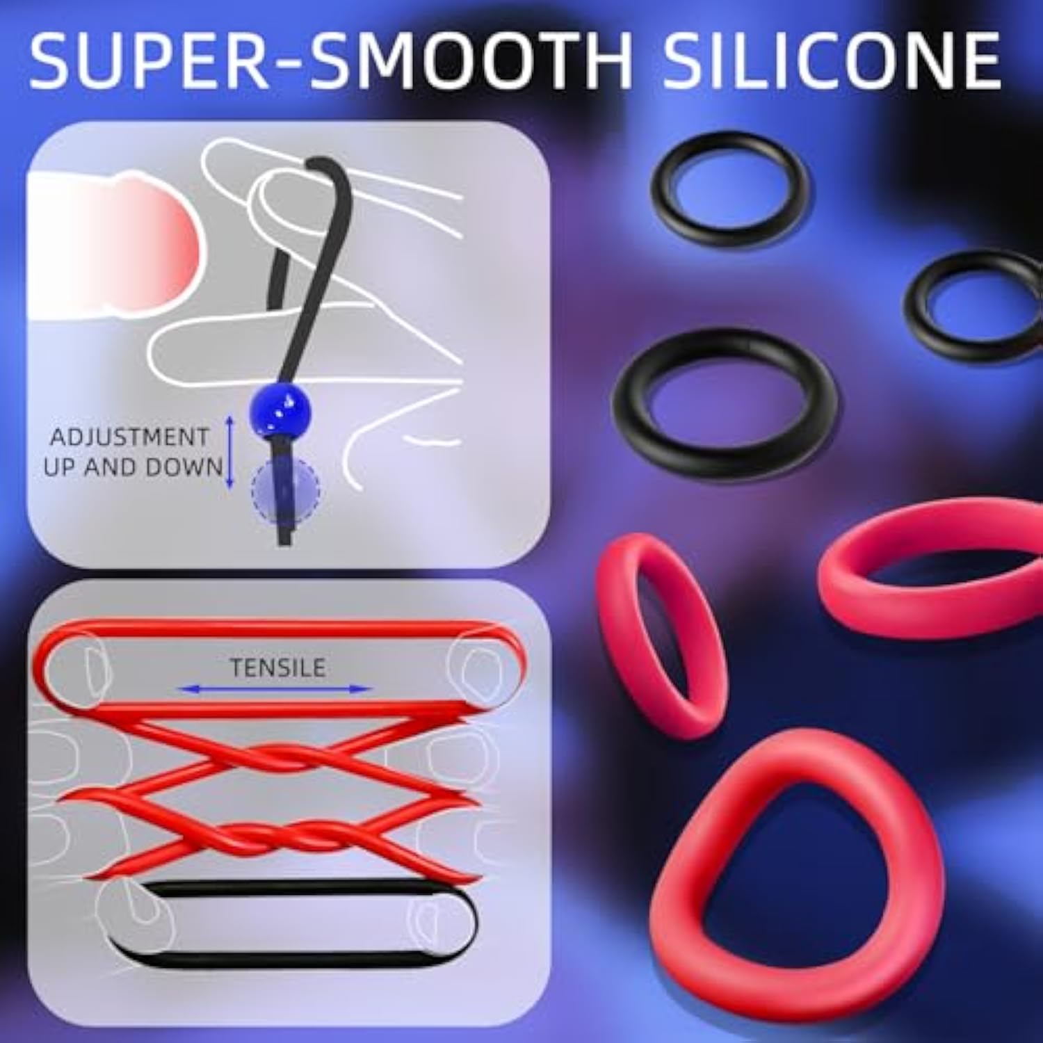 | 9Pcs Cock Ring Set Keeps Your Rod Up All Night: The Tight Firm Erection Rings Come With 9 Mens Cock Ring, So You Can Wear As Many As You Want! Slip Two, Three, Or Even More Rings Around Your Penis. The Extra Rings Help Collect More Blood In Your Shaft, Boosting Your Girth And Length To Help You Reach Your Full Size. They Also Increase Your Hardness For More Enjoyable Sex. | | Adjustable Penis Ring: The Product Has Silicone Material With Smooth Blue Beads, Can Slide Up And Down Freely To Adjust The Size, No Matter Your Brother Is Very Big Or Normal Size Can Meet The Wearable Size, Combined With The Characteristics Of The Silicone Material Itself Is Not Easy To Slip, It Will Not Be Easy To Loosen When You Tie Up The Completion Of The Perfect Fit For Your Penis, The Use Of Pleasure Ring Sex Toys! | | Ideal For Men: When You Are Intimate With Her, You Can Choose To Use Our Silicone Ring To Bind Your Testicles Or You Can Choose To Lock It At The Root, Which Will Help You To Better Firm And Support Your Testicles, Locking In Your “Essence” And Increasing The Time Of Pleasure With Her. You Can Also Attach Silicone Cords While You “Practice” On Your Own, Which Will Help You Increase The Length Of Your Workout! | | Increase Sexual Experience: 9 Piece Penis Ring Set With Multiple Wearing Styles! The Penis Ropes Are Adjustable In Size And Comfortable To Wear. You Can Attach Them To Your Penis Or Testicles Separately, Or Use The Repositionable Beads To Wrap Both The Penis And Testicles At The Same Time! It Also Comes With 6 Different Sizes Of Silicone Rings To Fulfill Your Experience With All Of Them At The Same Time, Increasing Your Sexual Experience As A Couple! | | Super Smooth Material: Silicone Construction Is Soft, Flexible And Skin-Friendly, Ensuring A Comfortable, Non-Irritating Fit. Won’T Scratch, Easy To Clean And Can Be Used Over And Over Again. Use With Water-Based Lubricants For A Seamless Connection And Significantly Increased Hardness And Stamina, Making Every Encounter More Exciting. | |