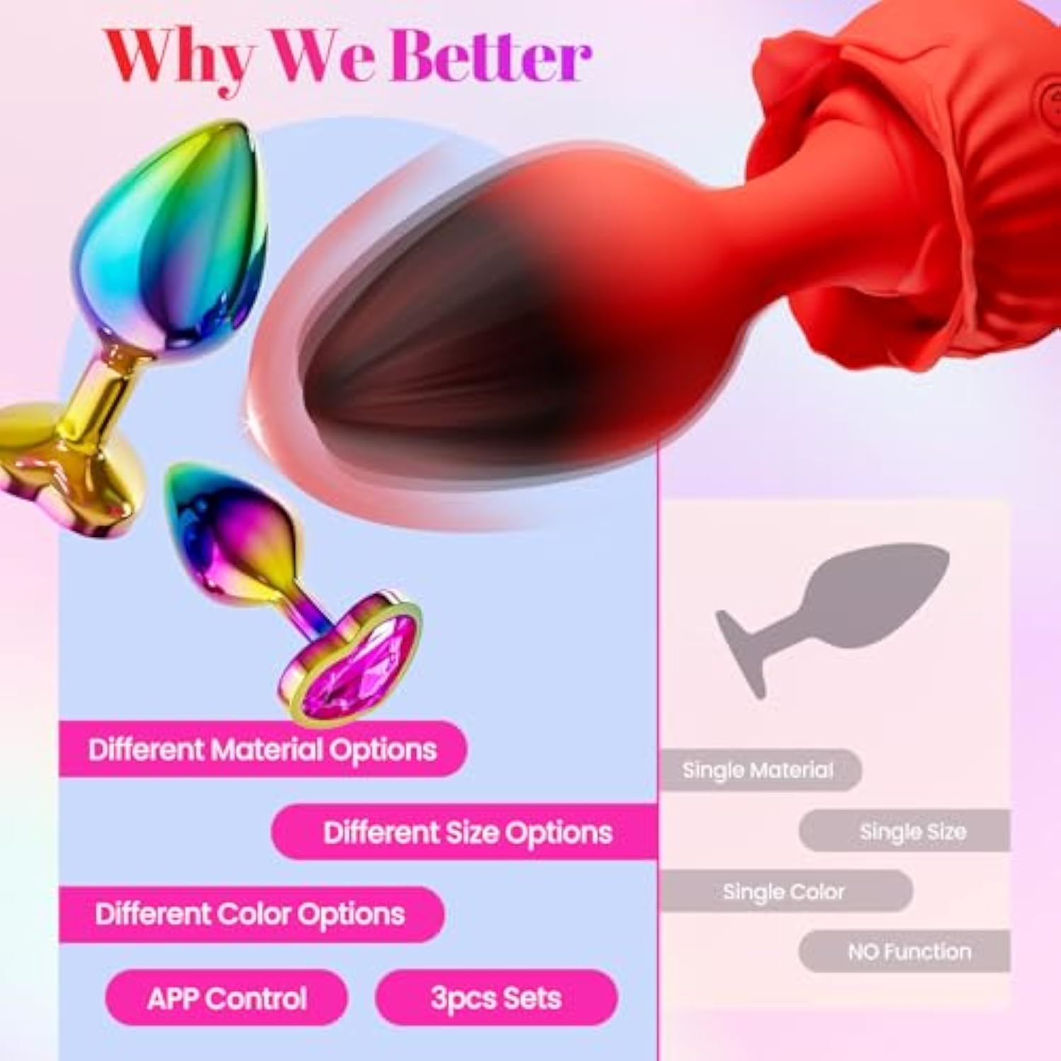 | 3Pcs Vibrating Butt Plug Set Anal Plug Training Kit: This Trainer Kit Contains 3 Anal Plugs In Different Sizes And Shape, Silicone Anal Plug With Stylish Rose-Shape Design And Colorful Stainless Steel Butt Plug With Hearts Jeweled Base. This Collection Caters To Every Level Of Pleasure Seeker. Progressive Sizes Encourage Safe, Comfortable Training | | 11 Vibrations: The Butt Plug Adult Toys Vibrating Anal Toys Has 11 Vibration. From Gentle To Intense Vibrations, It Gradually Stimulates Pleasure From The Anus To The Perineum To The G-Spot And Deepest Parts Of The Channel, Cascading Until You’Re Climbing To Sex Pleasure. Whether You’Re A Man Looking For Prostate Massager And Anal Stimulation, A Woman Trying Anal Sex For The First Time, Or A Couple Looking For Intimate Stimulation, This Versatile Adult Toy Is The Ideal Choice For A Multidimensional Sensual And Stimulating Experience. Vibrating Rose Anal Plug And Colorful Stainless Steel Butt Plug Combines Static Fullness With Thrilling Vibration | | Soft-Safe Silicone Anal Plug Stainless Steel Butt Plug: Large Vibrating Anal Plug Is Made From Ultra-Soft, Body-Safe Silicone That Feels Silky Smooth Against The Skin. The Small And Medium Anal Butt Plug Toys Are Crafted From High-Quality, Polished Stainless Steel With A Vibrant, Eye-Catching Finish. The Solid, Weighty Feel Of Metal Provides A Unique Sensation Ideal For Temperature Play — Simply Warm Them Up Or Cool Them Down For An Extra Thrill And The Rigid, Non-Flexible Structure Offers A More Solid, Intense Feeling Of Fullness And Pressure | | Elegant Rose-Shaped Base Stainless Steel Plug With Luxury Jewelry Design: Designed With A Beautiful Rose-Shaped Base, The Large Plug Isn’T Just Functional — It’S A Visual Treat. The Striking Red And Black Color Combination Adds An Extra Touch Of Elegance, While The Wide Base Ensures Safe, Worry-Free Play By Preventing The Toy From Slipping. Perfect For Those New To Anal Exploration, Small And Medium Plugs Base Is Decorated With Well-Made Heart Shape Jewellery, Feature Sleek, Smooth Finishes In Bright, Dazzling Colors. It’S Both A Piece Of Erotic Art And A Reliable Companion For Your Intimate Adventures | | App Controlled Anal Plug-Multiple App Features: It Not Only Has Recording, Music And Other Patterns Functions, But Also A Rich Collection Of Massive Video Functions And Diy Functions. It Can Meet The Needs Of Both Couples And Solo Users In Terms Of Richness. Different Styles Of Videos Can Create Immersive Experiences When Using The Product, And You Can Sync And Diy Your Own Mode. Wireless Control From Anywhere — Whether Playing Solo, With A Partner, Or Spicing Up Long-Distance Encounters. Customize The Rhythm And Intensity To Suit Your Mood And Desires In Real Time | | After-Sales Service Discreet Butt Plug: Our Adult Toy Prostate Massager Sex Anal Toys Butt Plug Vibrator For Women Are Shipped In A Discreet Package. We Value Our