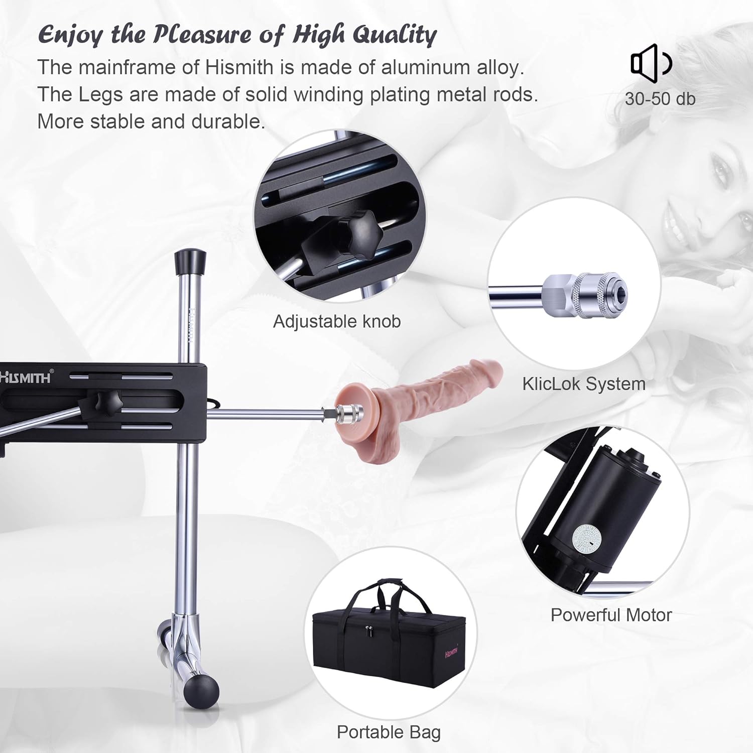 • ? HIGH-QUALITY: The mainframe of Hismith is made of aluminum alloy. The Legs are made of solid winding plating metal rods. More stable and durable. All dildos are made out of silicone, super flexible, stretchy, liable ,non-toxic and no smell. Its also easy to clean with warm water and mild soap, or sex toys cleaner.