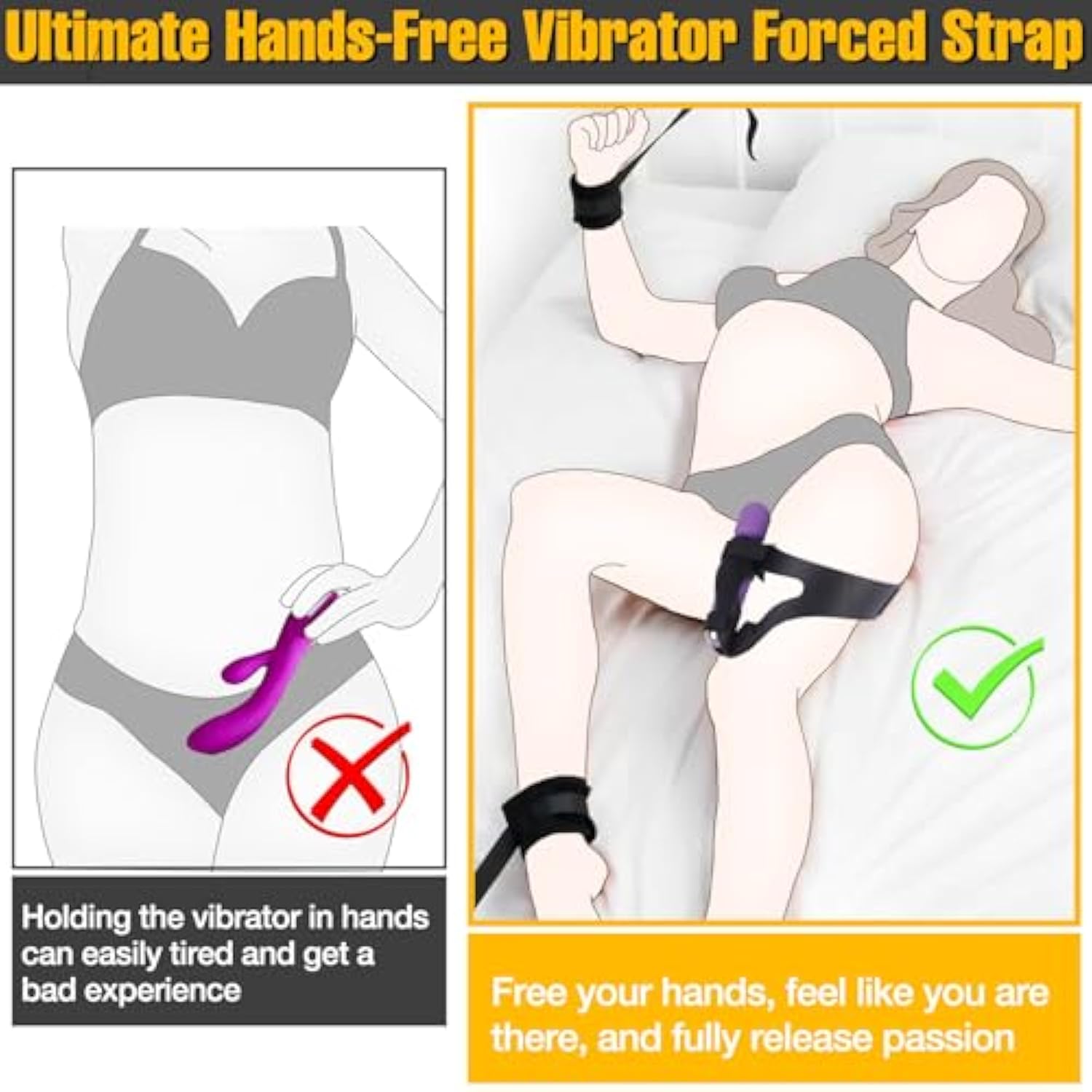 Vibrator Forced Strap For Self-Pleasure: Crafted With Precision, This Forced Orgasm Harness Seamlessly Blending Superior Craftsmanship With Practicality. The Vibrator Forced Strap Securely Holds Wand Massager Or Vibrator Between Legs, Allowing To Effortlessly Enjoy The Ultimate Vaginal Climax | | Vibrators Wand Massagers Holder For Women Hands-Free Play: Experience New Sensations And Liberate Your Hands With Our Adjustable Strap Vibrator Harness Stand. Whether Standing Or Lying Down, This Innovative Device Enhances Sensory Pleasure And Fuels Erotic Imagination, Making Sexual Experience More Immersive | | Premium Durable Material: Made With High-Quality Pu Leather, Soft Sponge And Sturdy Metal Buckles, This Bondage Restraints Kit Is Designed For Extended Wear, Offering Long-Lasting Durability And Reliability For Frequent Use. The Sex Bondage Set Fits Snugly, Is Soft And Comfortable Against The Skin, And Provides Solid Support, Ensuring Safe Play. This Premium Construction Makes It A Stylish And Practical Addition To Your Collection | | Super Elasticity And Fully Adjustable Sizes: The Sex Straps Of Forced Orgasm Control Set Are Elasticity And Adjustable, Can Accommodate Thigh Circumference From 21.5 Inches To 26 Inches, Larger Side Of Constrained Straps From 5 Inches To 8 Inches, The Smaller Side Of Constrained Straps From 2.5 Inches To 7 Inches. The Velcro Design Ensures You Can Adjust The Size Precisely To Wrap Tightly For Personalized Fit | | Compatible With Most Vibrators Wand Massagers Dildos: The Massage Stick Fixing Belt Can Securely Fit Vibrators Of Various Sizes, Such As Hitachi Magic Wand, Vibrating Dildos, Realistic Dildos, Butterflies Vibrators, Clitoral Vibrators, G-Spot Vibrators, Rabbits Vibrators And So On. Quick And Hassle-Free To Install, Requiring Just A Few Minutes, Easy Cleaning And Maintenance For Long-Lasting Durability, Small And Lightweight, Perfect For Carrying Around And Traveling | |