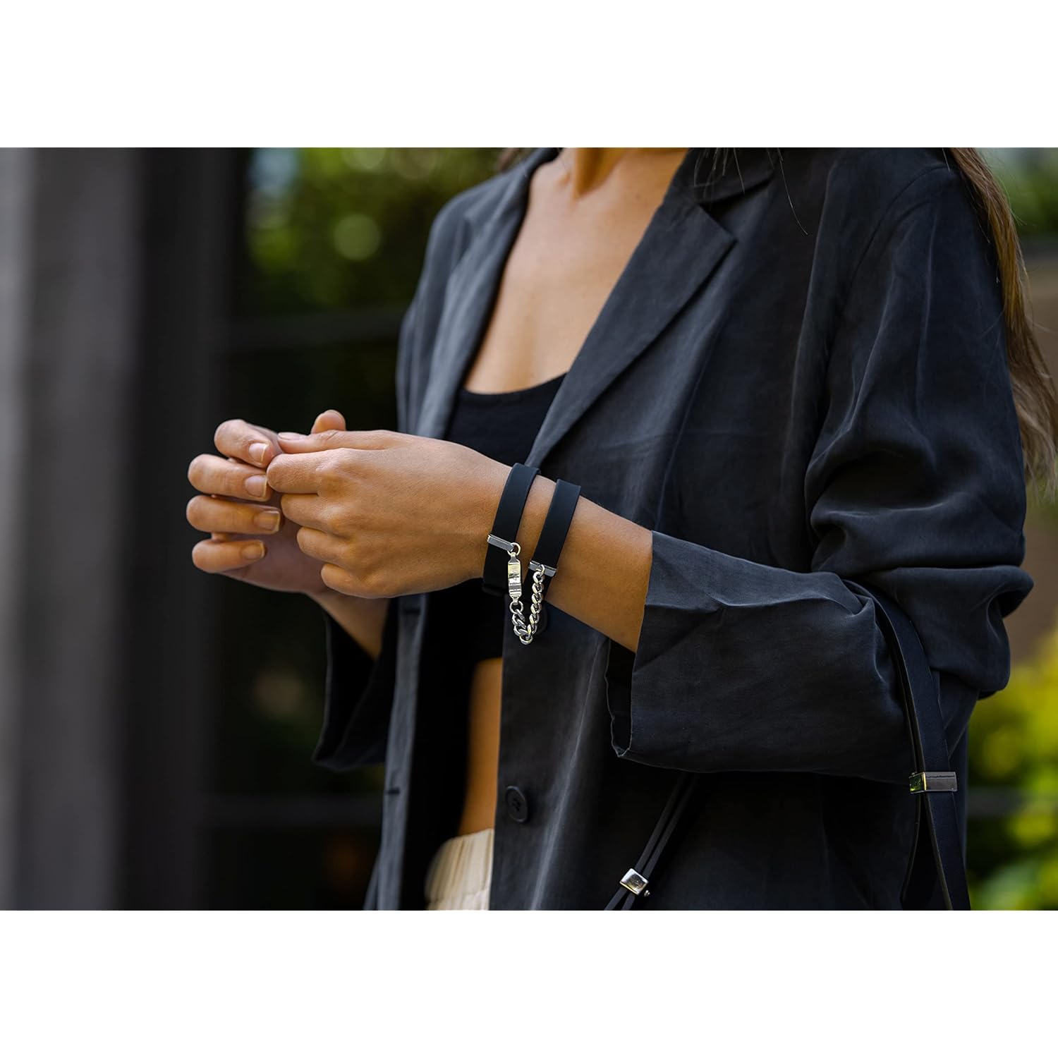 SEX HANDCUFFS: The ID Cuffs Adult Handcuff Sex Toy Accessory features a chic, stacked design that seamlessly transitions from a fashionable bracelet to a functional handcuff | The silicone bands on our Kinky HandCuffs Adult Bracelet are soft and flexible, providing a comfortable fit that adapts to your wrist | The nickel-free plated metal accents add a touch of sophistication, making these Handcuffs for sex Adult Toy Accessory a stylish accessory for any occasion