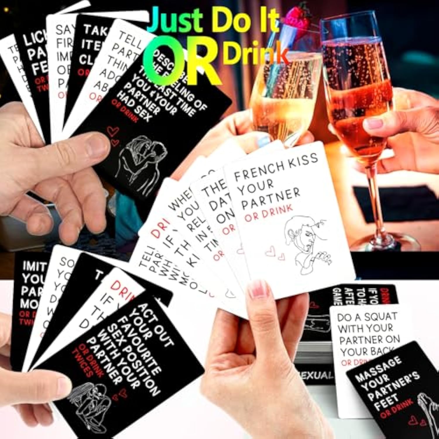 | Practical Foreplay Tool: The Drinking Game Card Is A Couple Card Game That Is A Simple But Effective Tool To Provide Interactivenight Ideas. Each Card Presents A Dare And Through Them, Achieve A More Fun Sex Life. | | Easy To Learn: This Card Game Includes 50 Drinking Cards. Each Drinking Card Offers A Dare. Draw A Card And Finish The Dare. If You Don’T Finish The Dare. Then Drink According To The Card’S Instructions. | | Perfect Couples Gift: Awesome Gift And Great Recipe For A Romantic Evening Together. This Sex Card Is A Romantic Gift For Him Or Her To Enrich Your Sex Life. Gift These Card Game To Your Partner And Watch The Love Bloom! | | Spice Your Sex Life Up: Use The Cards As Positional References To Build Your Fantasy. You Can Also Create More Fun Sex Gameplay Based On Your Imagination. | | Discreet Package And Delivering: Your Private Information Is Perfectly Protected, No Sensitive Words Will Appear On The Packaging. | |