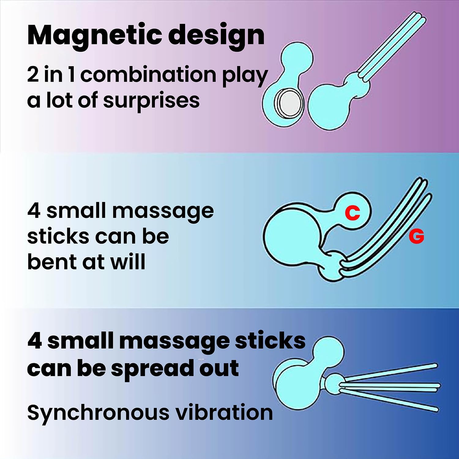 • Creative play DIY: The 4 sticks of the Gatling vibration sex toy can work together to form a large Dildos, Made of soft silicone material, easy to enter. the 4 sticks can also be separated to form 4 small vibrator, It’s like four fingers vibrating and caressing four body parts at once. The 4 sticks can be bent and combined arbitrarily, so it can be used to stimulate the G and C spots at the same time for more pleasant experience. finally the 4 sticks are used together with another detachable part at the other end, to explore a variety of massage methods