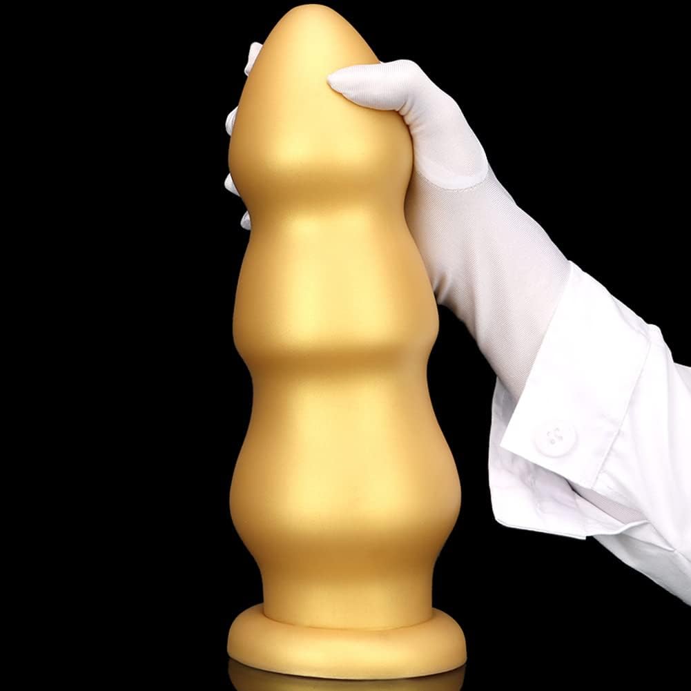 Gold Thick Anal Beads: Flexible Liquid Silicone Butt Plug, Vaginal & Prostate Massage Stimulation, Strong Suction Base, for Men & Women (L)