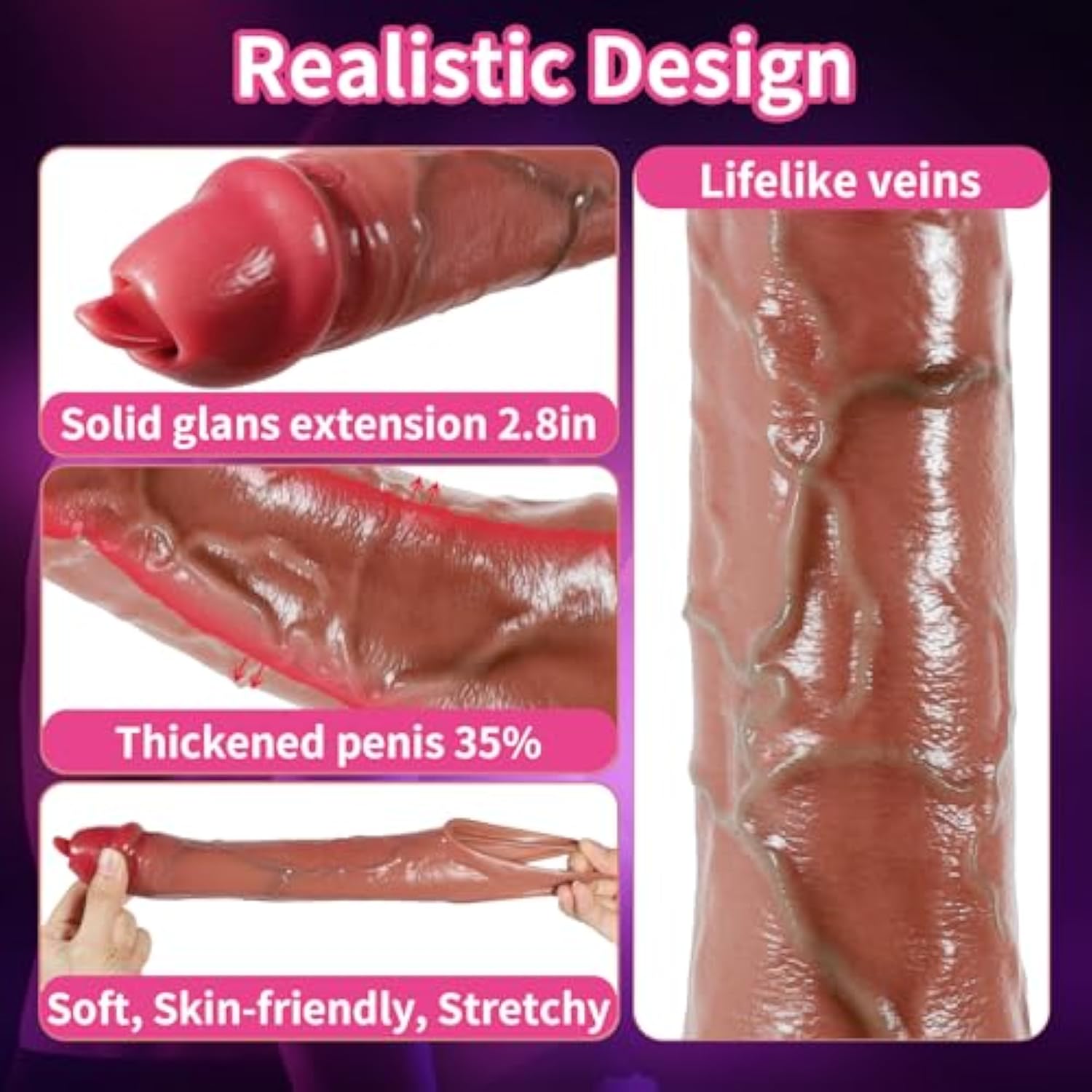 | Penis Extender For Enhanced Pleasure: Boost Confidence Satisfaction! Our Upgrade Penis Sleeve Adds Up To 3.1 In In Length And 35% Extra Girth, Empowering You With Newfound Confidence. This Cock Sleeve Designed To Improve Stamina, The Top Of The Glans With A Small Simulated Tongue That Stimulates The Clitoris For Mutual Satisfaction, Making It The Ultimate Couples’ Pleasure Tool. | | 9 Vibrations With Remote Control: This Vibrating Penis Sleeve Doubles As A G-Spot Vibrator, Clitoral Stimulator, Or Anal Toy, Perfect For All Genders. With 9 Vibration Modes And A Handheld Remote, You Or Your Partner Can Take Control—Hand Over The Reins For A Thrilling Power-Play Experience. | | Realistic Design With Elastic Straps: Crafted With Lifelike Detail, This Couple Sex Toy Showcases Vein-Textured Skin, True-To-Life Colors, And Ultra-Soft, Skin-Like Material. The Secure Head Lock Delivers Intense Stimulation, While The Integrated Scrotum Ring Stabilizes The Toy, Prolongs Erections, And Delays Climax For Extended, Mind-Blowing Sessions. | | Ipx6 Waterproof Fast Charging: Our Penis Sleeve Vibrating Dildo Is Completely Waterproof And Can Be Used In The Shower. Easy To Clean And Reusable. Hidden Charging Port Is On The Back Of The Glans, A Full Charge Time About 50 Minutes And 45-75 Minutes Of Use. Usb Dc Charging Cable Is Also Included In The Package, Convenient To Connect The Usb Port For Charging When Camping, Car Sex And Traveling. | | Soft, Flexible Body-Safe: Made From Premium Liquid Silicone, This Odorless, Tasteless Sleeve Penis Vibrator Molds Gently To Your Body For A Natural, Comfortable Fit. Pair With Water-Based Lube For Smooth, Friction-Free Pleasure. | | Discreet Silent Operation: Designed For Quiet Use (≪50 Decibels), Our Adult Sex Toys Arrive In Neutral Packaging To Protect Your Privacy. Every Product Is Brand New And Backed By Exceptional