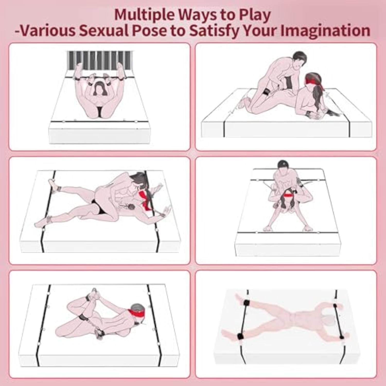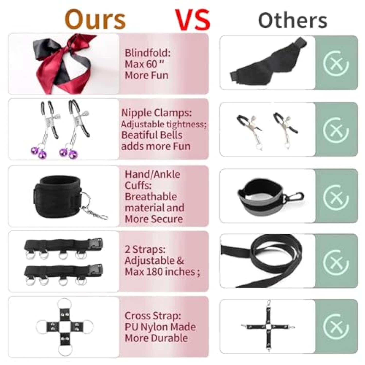 | ?Bondage Her To The Bed For Kinky Delights?Transform Your Bed Into A Devious Piece Of Bondage Furniture With This Bed Restraint Set, Then Make Her Wrists And Ankles Spread Open, Once Your Lover Is Bound And Vulnerable, Do As You Please! Watch Them Writhe In Pleasure And Pain As You Spank, Tickle, And Fuck Them. They Will Love Feeling Helpless To Your Every Desire Until You’Ve Had Your Way! | | ?11Pcs Bdsm Kit Versatile Bed Restraints?This Sex Bondage Set Can Fulfill All Your Fantasy. This Bed Bondage Kit Contains Hand/Ankle Cuff*4, Separated Bed Spreader Strap*2, Hogtie Cross Strap*1, Blindfold*1, Adjustable Nipple Clamp*2, Feather Tickler Paddle*1. The Complete Bdsm Sex Toys Set Is Featured With Multiple Using Ways, Such As Bed Restraints Play, Separately Body Bondage Play And So On. Great To Enhance Sexual Pleasure, Whether You’Re A Bondage Beginner Or An Experienced Enthusiast | | ?Upgraded Adjustable 2 Sex Straps + Blindfold?Crafted With High Quality Durable Material, This Bdsm Toys Sex Restraint Kit Features 2 Separate Straps For Quick And Easy Restraint Set, Each 180”Strap Adjusts To Fit Any Size Bed. The Sex Blindfold Fits Comfortably Over Your Partner’S Eyes, Immersing Them In Complete Darkness, Heightening Their Senses And Anticipation. By The Way, The Long And Soft Blindfold Can Be Used As Both An Eye Mask And A Bondage Strap For More Sex Fun | | ?2 Nipple Clamps +2 In 1 Feather Tickler Paddle Sparks Wild Sex?The Nipple Clamps Are Smooth Safe. It Can Be Adjusted For Tension Or Tightness According To Your Needs, Also Can Decorates Your Lover’S Beauty, The Crisp Pleasant Bells Adds More Fun In Games. Caress And Spank With The Smooth Bdsm Paddle, Or Tease With The Titillating Feather Tickler For Kinky Sex Submission And Enhanced Sensations. Unleash Fantasies With The Enticing Bdsm Restraints Set To Restrain Your Lover For More Pleasure | | ?4 Padded Sex Cuffs +Hogtie Cross Strap For Unlocking More Bondage Positions?The Bondage Cuffs Are Fully Adjustable, You Can Tighten Or Loosen Them As Needed, Velcro-Fastener Make Them Easily And Quickly To Remove. The Bdsm Cuffs Are Lightly Padded For A Comfortable Safe Fit, Also Sweat And Stickiness Resistant. Other Than Simply Connecting The Cuffs To The Nylon Straps Under Mattress, You Can Connect The Hog Tie Cross Strap /Lobster Clasps Together With Sex Cuffs To Unlock More Posture | | ?Easy To Use – Adjustable, Detachable Portable?The Sm Straps Sex Restraints Set Are Adjustable To Meet Your Specific Needs. With Detachable, Flexible Clasps, Slipping Buckles, The Sex Straps, Cuffs And Other Accessories Can Be Easily Installed, Detached And Adjusted. To Ensure The Durability And Stability, Crafted With Premium Metal And Nylon Materials, Featuring Visually Stitching Craftsmanship. Weighing About 0.95Lb Per Set, This Portable Convenient Couples Sex Toy Is Ideal For Travel. | | ?Discreet Packaging Satisfaction Caring?This Adult Toys Kit Is Discreetly Packaged To Ensure Personal Privacy. Quality And