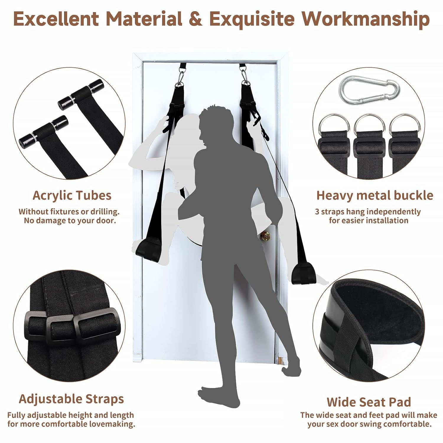 Easy To Install And Carry: The Sex Straps Is Easy To Install, Just Put The Part Of Acrylic Pipe Separately Over A Door And Close It, Then Hang The Straps In Order And Adjust In A Perfect Length, Easier And Labor-Saving. The Hanging Door Swing Can Be Used Everywhere, Such As The Bathroom Door, Living Room Door, Kitchen Door Or Bedroom Door. Will Give You Different Stimulation And Experience In Different Scenes. You Will Know How Easy It Is To Hold Multiple Positions And Easy To Control Your Movements To The Perfect Spots! The Most Important There Is No Weight Limited For Our Sex Strap, Even You Are More 300Lb.