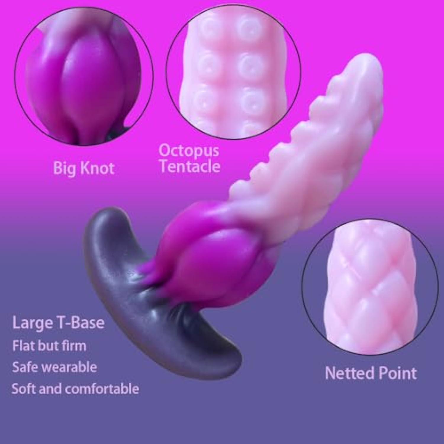 | Material?The Tentacle Butt Plug Toy With Big Knot Is Made Of Liquid Silicone,Very Soft,No Odor, No Color Loss, Nice Touch Feelings In Hand, The Thickened T-Base Handle Is Wearable,Not Easy To Damage, So You Can Use It With Confidence. | | Size?5.31X3.54 Inches,Weight 5.3 Oz,Maximum Insertion Diameter 1.38-1.77 Inches. | | Design?The Colorful Solicone Anal Plug Is Tentacle Shape With Big Knot,Convenient To Insert Inside,The Tentacle Anal Plug Plunger Has Netted Point For Enhanced Stimulation.The Base Is T Shaped For Easy Wearable Gripping And Wide Enough To Snap In Nicely, Freeing Up Your Hands And Preventing The Anal Plug From Slipping Into Your Anus. | | Use?Clean Before And After Use,And Suggested To Use It With Lubricant,Which Will Bring Better Experience. | | Discreet Packaging?The Butt Plug Comes In Discreet Packaging. There Will Be Absolutely No Gender Or Sensitive Words On Your Package, You Can Buy With Confidence.This Adult Anal Sex Toy Is A Great Gift To Your Loved One! | |