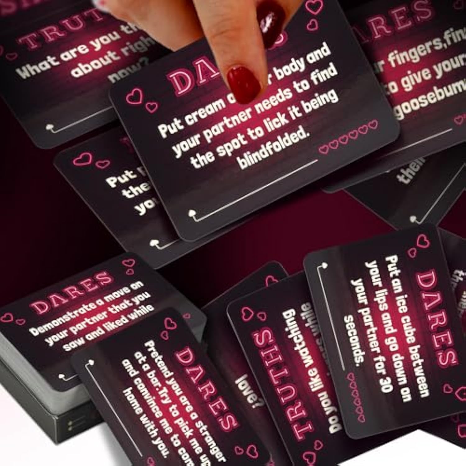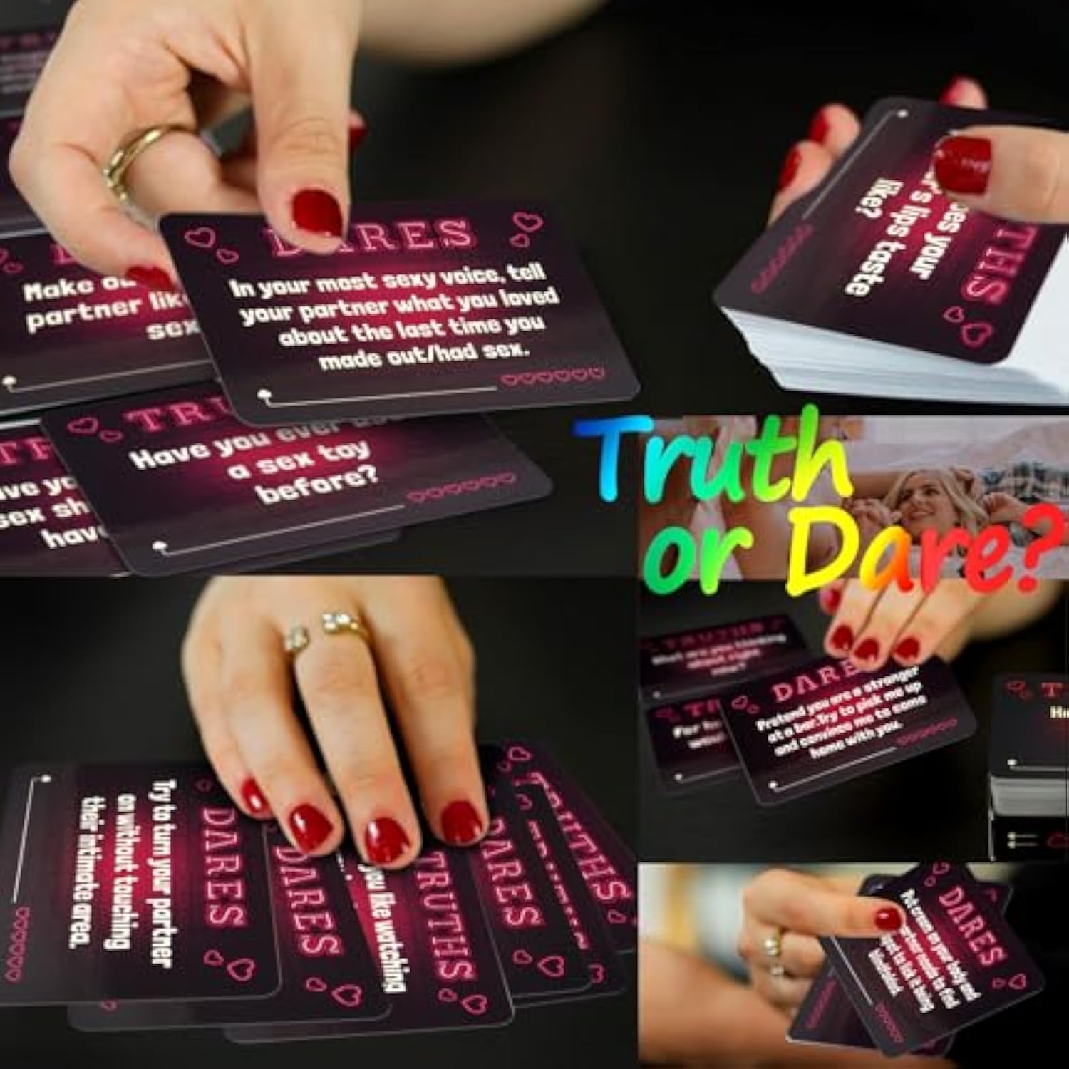 | Practical Foreplay Tool: The Truth Or Dare Card Is A Couple Card Game That Is A Simple But Effective Tool To Provide Interactivenight Ideas. Each Card Presents A Truth Or Dare And Through Them, Achieve A More Fun Sex Life. | | How To Play: Simply Shuffle The Deck And Take Turns With Exciting Truth Or Dare Challenges That Explore Your Relationship In A Fun Way! Earn Points For Each Challenge You Complete (Keep The Card), And See Who Wins The Ultimatenight. | | Fun Couples Card Games For Adults: Get To Know Your Partner Better With Truth Or Dare Couples Games. This Card Deck Included 50 Truth Or Dare Cards Made For Couples. | | Perfect Couples Gift: Awesome Gift And Great Recipe For A Romantic Evening Together. This Sex Card Is A Romantic Gift For Him Or Her To Enrich Your Sex Life. Gift These Card Game To Your Partner And Watch The Love Bloom! | | Discreet Package And Delivering: Your Private Information Is Perfectly Protected, No Sensitive Words Will Appear On The Packaging. | |