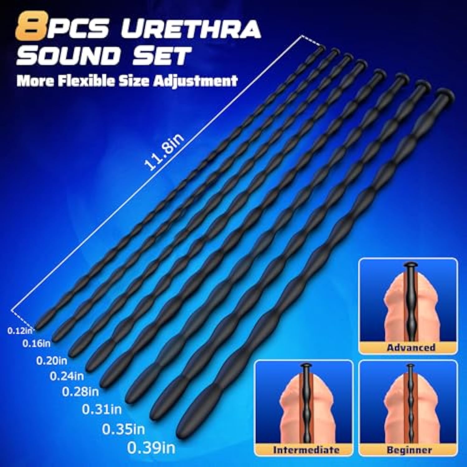 | 8 Pcs Urethra Sound Sets For Personalized Training: The 0.12“ To 0.39” Diameter And Bead Textures Meet The Experience Level Of Beginners To Intermediate To Advanced Users, The 11.8″ Flexible Silicone Urethral Plug Penis Toy Progressively Allowing You To Unleash Your Deepest Desires, Stretching, Teasing, And Stimulating Every Nerve In The Penis | | Flexible Soft Silicone Urethral Plug For Exploration Play: Body-Safe, Flexible Silicone Sounding Rods Urethra Dilators Easily Inserts Into The Penis, Giving You Secure Control Over The Tightest Curves Of The Urethra And Penetrating The Prostate, Delivering A Cozy, Throbbing Stretches For Male Sexual Pleasure | | Upgraded Seductive Smooth Penis Plug: Using The Latest Polishing Technology To Make The Surface Of The Catheters Sounds Set Smoother And Softer To Minimize Discomfort, Dilators Sounding Toy Slides Effortlessly Deeper, Awakening Raw, Pulsating Sensations As You Push Your Limits | | Ergonomi