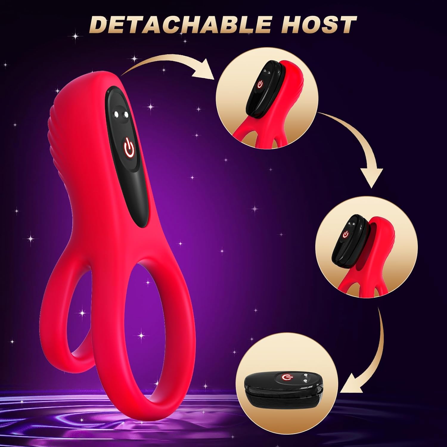 ?9 VIBRATIONS MODES COCK SEXUAL STIMULATION DEVICE WITH DETACHABLE HOST?:The pleasure ring for men featured a intense motor with 9 vibrations, designed to provide powerful and penetrating vibrations, catering to the stimulation of the clitoris, or testicles, intense G-spot and vaginal stimulation. Both partners will enjoy the powerful vibrations, this vibrating cock ring can leading to more intense climaxes. The motor part also can be removed from the rest in order to wash it easier.