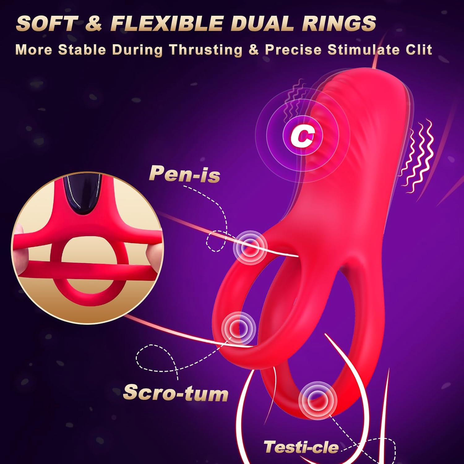 ?COUPLE SEX TOYS?:Synchronous Quartet Stimulus for Penis, Testicles, C Spot, and G Spot. This penis ring is paired with 2 rings for shaft erection and ball constriction. The front end vibrator of this vibrating cock ring fits the penis and unleashes intense vibration to G spot. Experience unmatched pleasure with simultaneous C spot vibration, perineum & testicle massage, and penis stimulation.