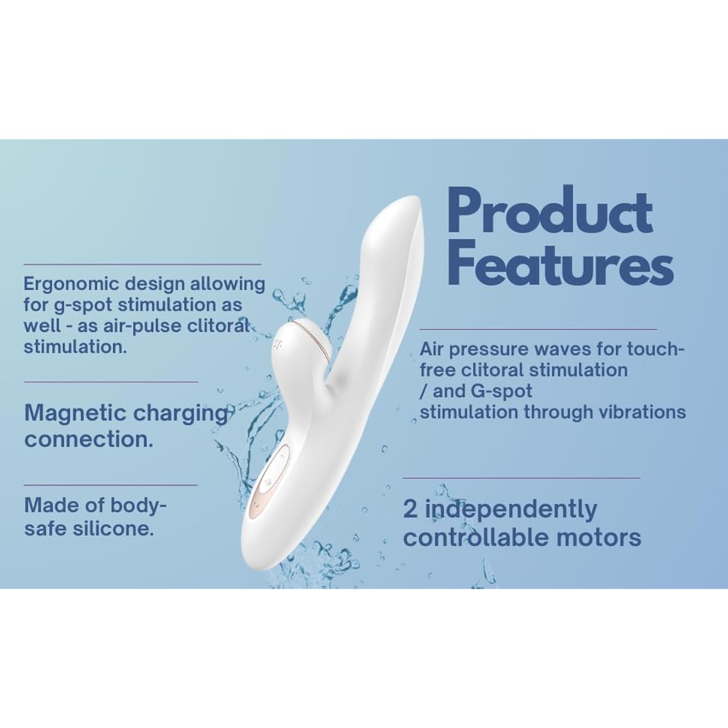 | Dual Stimulation: Features Air Pulse Technology For Touchless Stimulation Plus Vibration Functionality With Two Independently Controllable Motors | | Ergonomic Design: Specially Curved Shape Provides Targeted Stimulation While Maintaining Comfortable Handling And Control | | Premium Materials: Constructed With High-Quality, Body-Safe Silicone For A Luxurious Feel And Complete Peace Of Mind | | Convenient Charging: Magnetic Charging Connection Ensures Easy, Secure Power Replenishment When Needed | | Versatile Control: Multiple Intensity Settings And Patterns Available Through Separate Motor Controls For Customized Experience | |